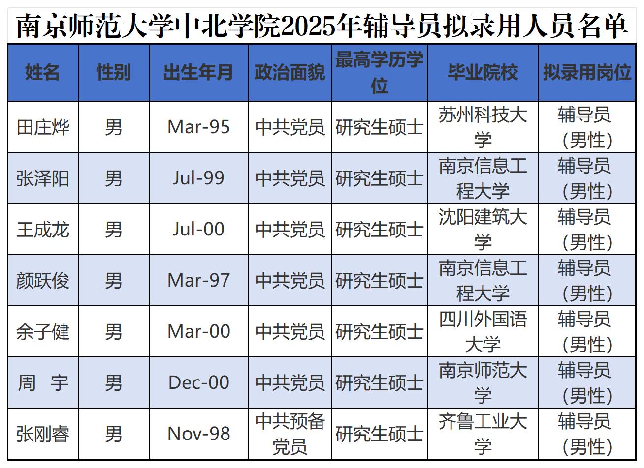 根据我院2025年7月21日发布的《南京师范大学中北学院2025年辅导员招聘公告》有关规定,经过笔试、面试、政审、体检等程序,确定田庄烨等7位同志为拟录用人员,现面向社会公示。
